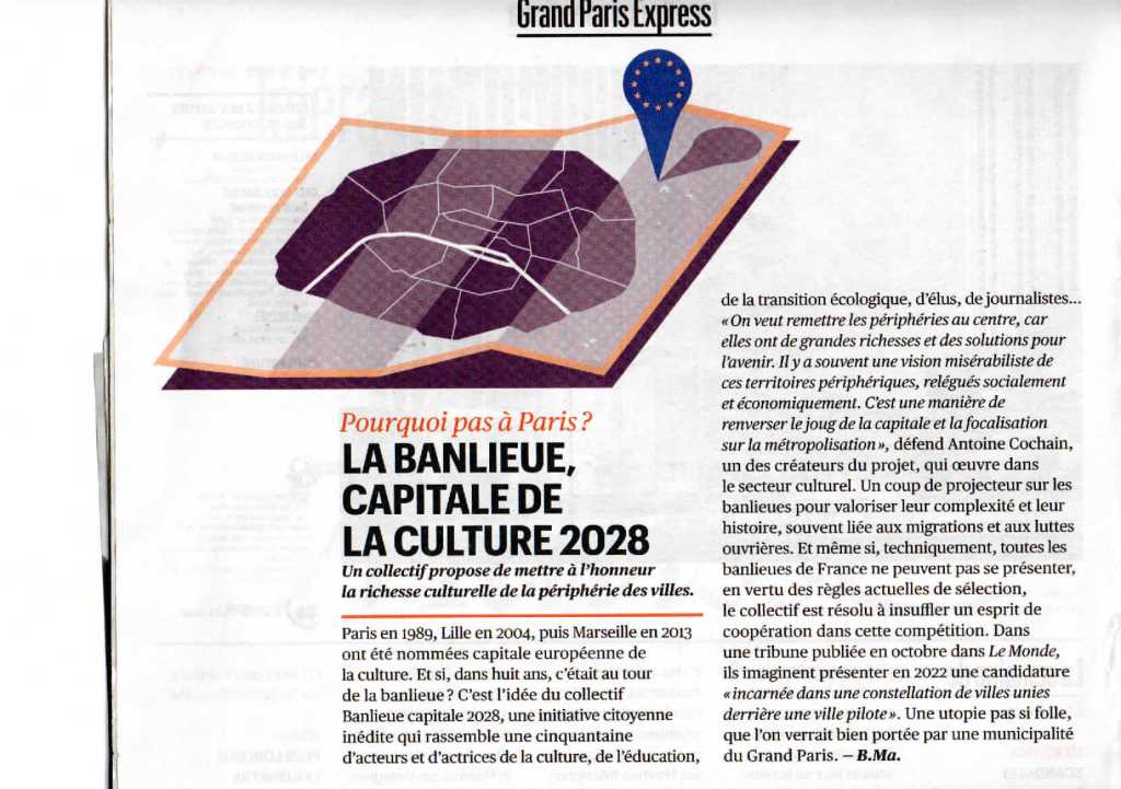 Paris en 1989, Lille en 2004, puis Marseille en 2013 ont été nommées capitale européenne de la culture. Et si, dans huit ans, c’était au tour de la banlieue ? C’est l’idée du collectif Banlieue capitale 2028, une initiative citoyenne inédite qui rassemble une cinquantaine d’acteurs et d’actrices de la culture, de l’éducation, de la transition écologique, d’élus, de journalistes… « On veut remettre les périphéries au centre, car elles ont de grandes richesses et des solutions pour l’avenir. Il y a souvent une vision misérabiliste de ces territoires périphériques, relégués socialement et économiquement. C’est une manière de renverser le joug de la capitale et la focalisation sur la métropolisation » , défend Antoine Cochain, un des réateurs du projet, qui oeuvre dans le secteur culturel. Un coup de projecteur sur les banlieues pour valoriser leur complexité et leur histoire, souvent liée aux migrations et aux luttes ouvrières. Et même si, techniquement, toutes les banlieues de France ne peuvent pas se présenter, en vertu des règles actuelles de sélection, le collectif est résolu à insuffler un esprit de coopération dans cette compétition. Dans une tribune publiée en octobre dans Le Monde, ils imaginent présenter en 2022 une candidature « incarnée dans une constellation de villes unies derrière une ville pilote » . Une utopie pas si folle, que l’on verrait bien portée par une municipalité du Grand Paris. – B.Ma.