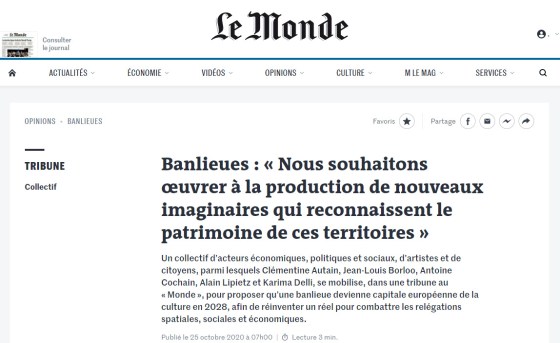 (Tribune parue dans Le Monde, le 25/10/2020) Et si nos banlieues devenaient « capitales » ?! Après Paris en 1989, Lille en 2004 … Plus
